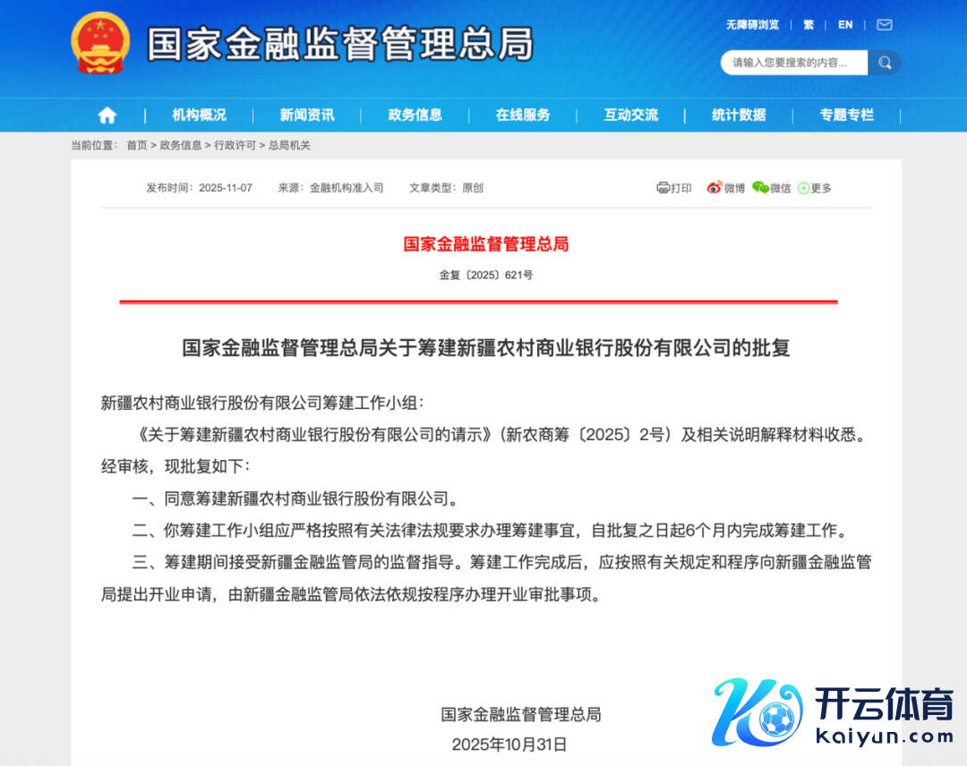11月7日,金融监管总局官网发布的讯息露出,新疆农村交易银行股份有限公司(以下简称新疆农商银行)已于10月31日获批筹建。