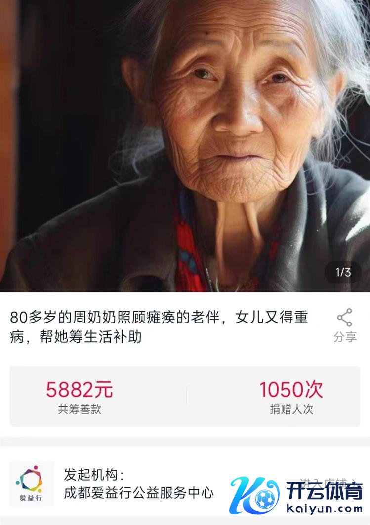 该博主指出,该捐赠项意见聚蚁集有三张相片齐是AI合成,每个老奶奶的相片齐不相通。联系蕴蓄泄露,店铺称呼为成齐爱益行公益干事中心,商品称呼为“80多岁的周奶奶关心瘫痪的老伴、男儿又得重病,帮她筹活命援救”,首页使用了三张相片,其中两张为别称老东谈主的面部特写相片,一张为老东谈主后头的相片。