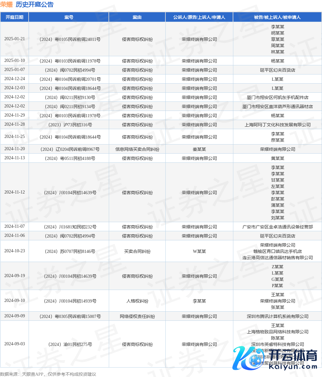 本站音书开yun体育网,把柄天眼查APP显露,近日公布了一则荣耀末端有限公司算作原告/上诉东谈主的开庭公告,详备执行如下: