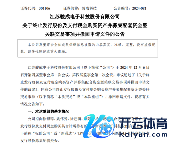 12月6日晚间,骏成科技(301106)公告称,公司原拟向徐锁璋、姚伟芳、徐艺萌、丹阳精易至诚科技搭伙企业(有限搭伙)刊行股份及支付现款购买其缱绻所捏有的江苏新表露电子科技股份有限公司(简称“新表露”)75%股份,同期拟向不跳跃35名特定投资者刊行股份召募配套资金。