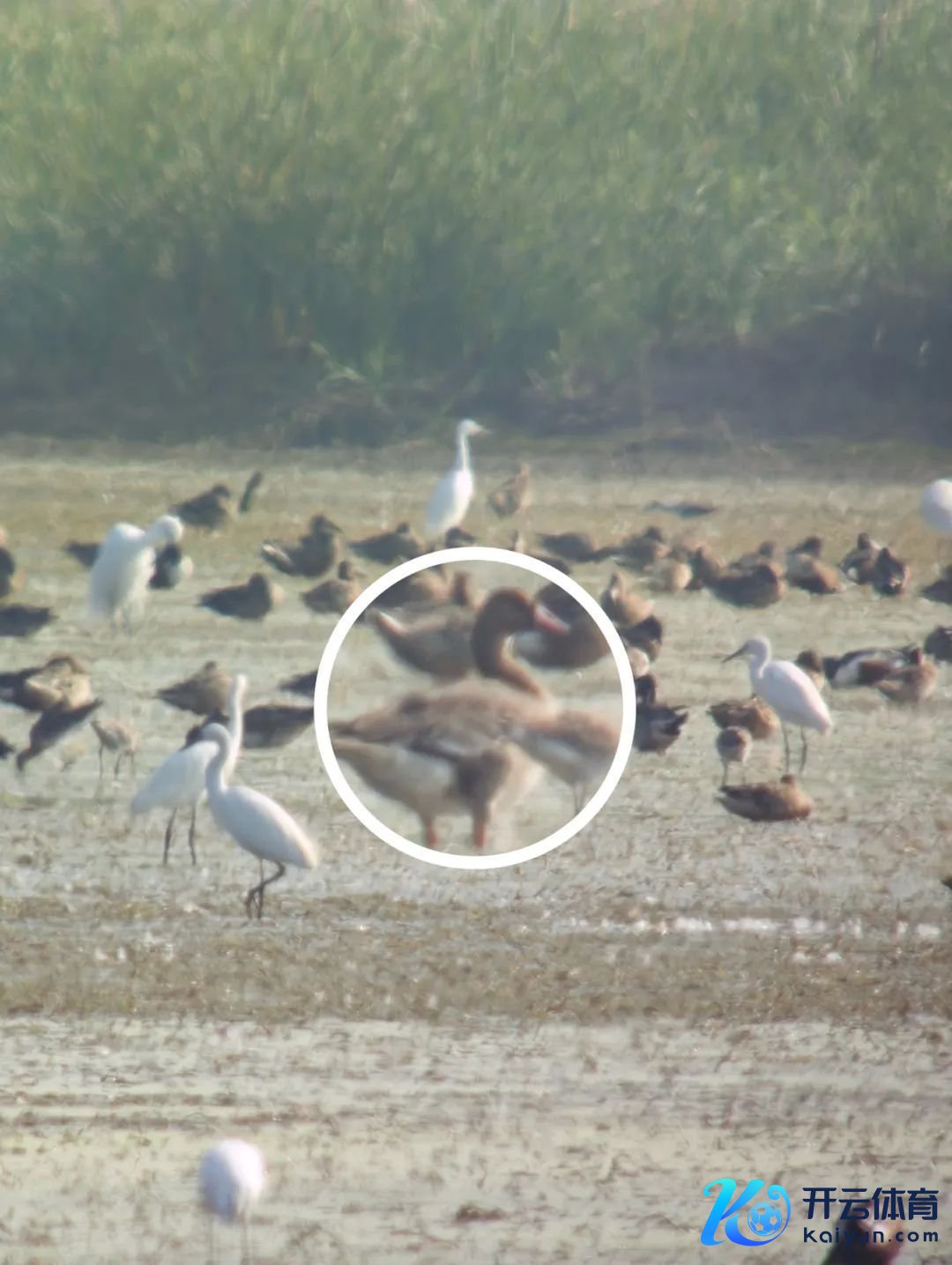 广东省科学院动物看管所看管员吴颢林在南沙湿地不雅鸟平台监测时发现灰雁正与广大水鸟站在浅滩觅食区中,显得相称机警。