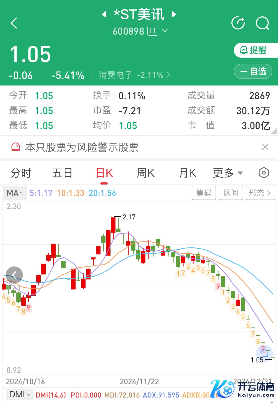12月31日,*ST好意思讯(即国好意思通信,600898)股价再度跌停,抵制发稿报1.05元/股,市值3亿元,已连结13个往将来市值低于5亿元。近期,公司还是连结7个往将来跌停。抵制三季度末,公司推进户数为是13685户。按退市新规,*ST好意思讯已锁定市值退市。